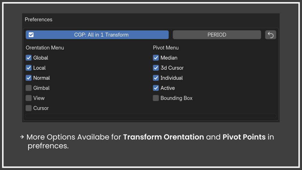 CG Pies All in 1 Transform is the Faster Transform menu for blender.
